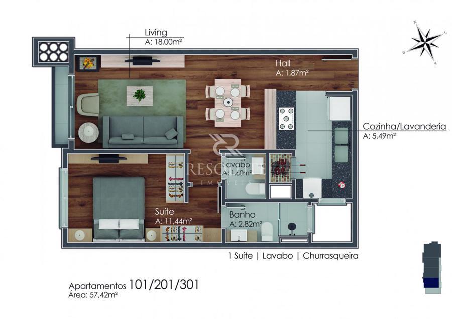 Área Global: 97,25m² | Área Privativa: 57,42m²
