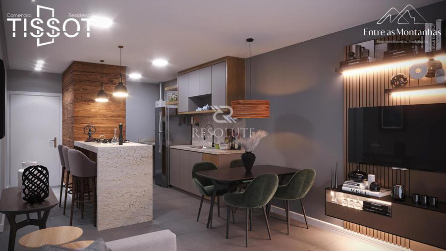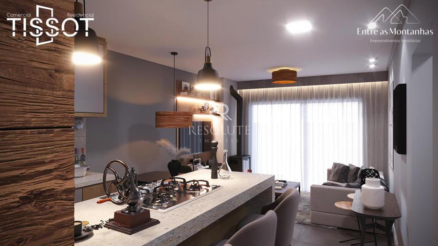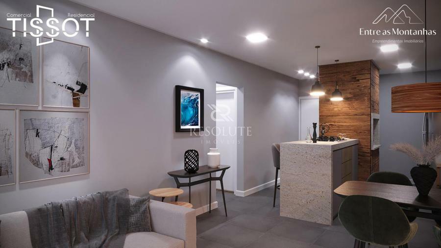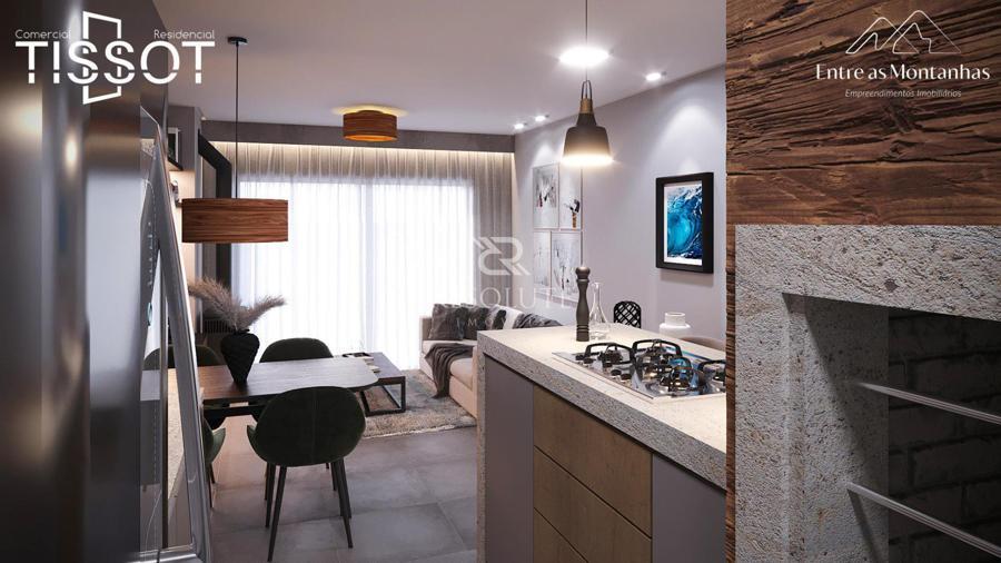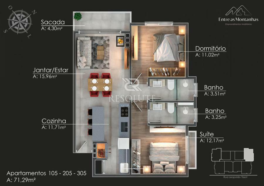 Em uma área de 51,04m², o apartamento se distribui em 1 dormitório, cozinha com churrasqueira, amplo living sala de estar e jantar com espera para lareira.