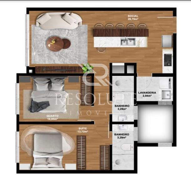 Apartamento distribuído em 02 dormitórios, (sendo 01 suíte), banho social, living integrado estar e jantar, cozinha americana com churrasqueira, excelente posição solar (Norte), área de serviço e 01 vaga de Garagem. Piso vinílico e porcelanato, aberturas em PVC.