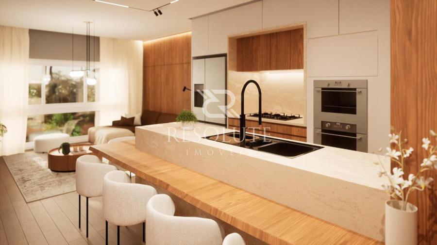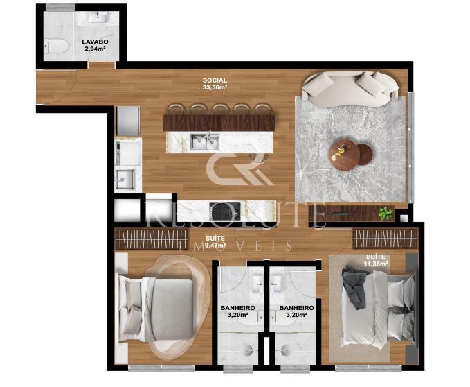 Apartamento distribuído em duas suítes, lavabo, living integrado estar e jantar, cozinha americana com churrasqueira, excelente posição solar (Norte), área de serviço e 01 vaga de Garagem. Piso vinílico e porcelanato, aberturas em PVC.