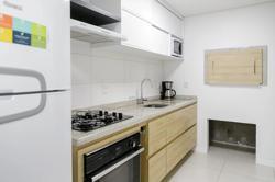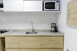 Área Social Completa: Sala de estar confortável com sofá-cama, cozinha moderna totalmente equipada e churrasqueira.