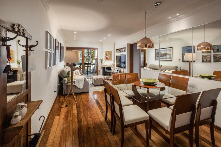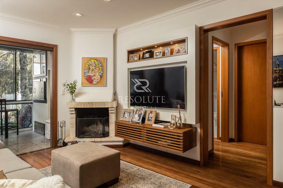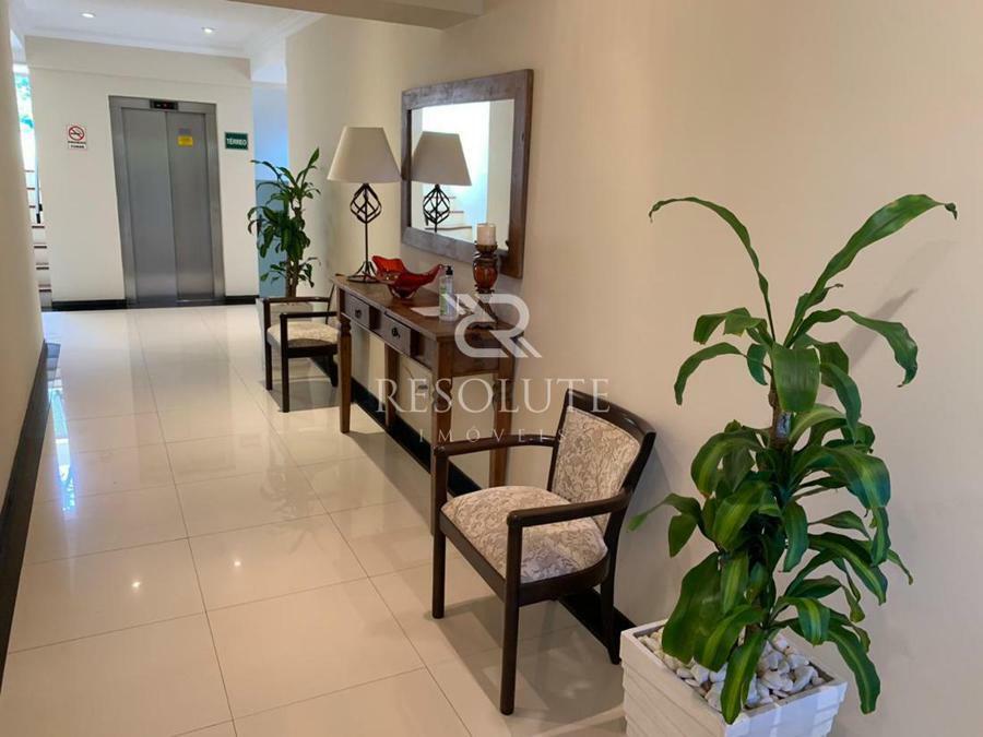 O apartamento mobiliado e equipado, distribuído em 02 dormitórios, sendo 01 suíte, banho social, sala em 02 ambientes sendo estar com lareira e jantar, sacada fechada com churrasqueira, cozinha completa, área de serviço separada e 01 box de garagem.
