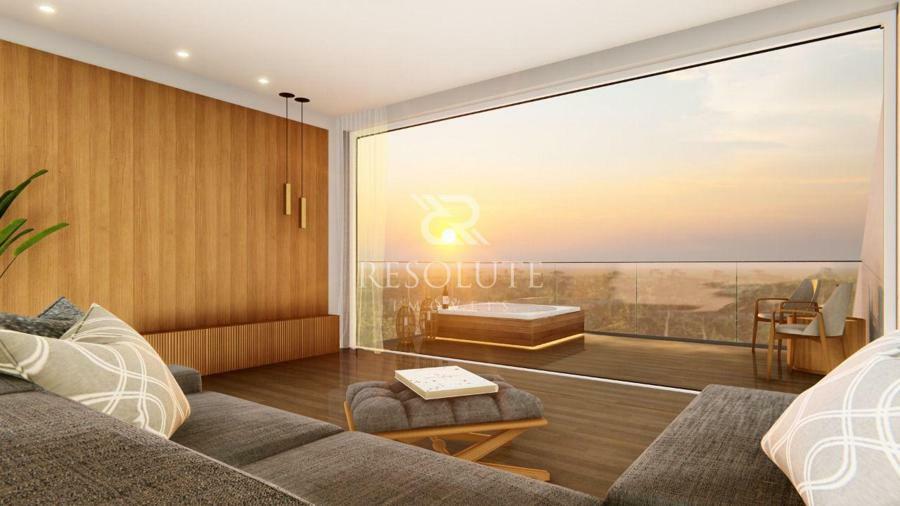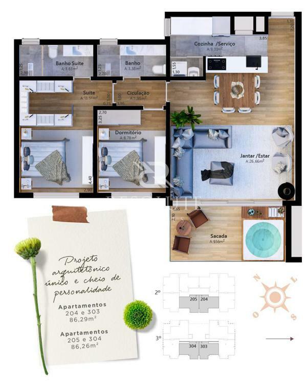 Apartamento amplo, com ótima distribuição interna em dois dormitórios, sendo um deles com suite; ampla sala de estar com 3,95 metros de largura com espera de lareira e ar condicionado e sacada aberta com área de 9,56 m² com espera para ofurô; living dois ambientes e cozinha americana com churrasqueira e área de serviço separada.