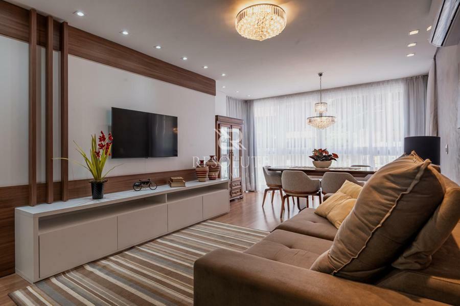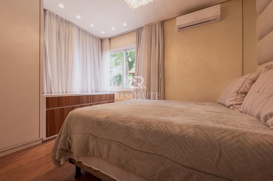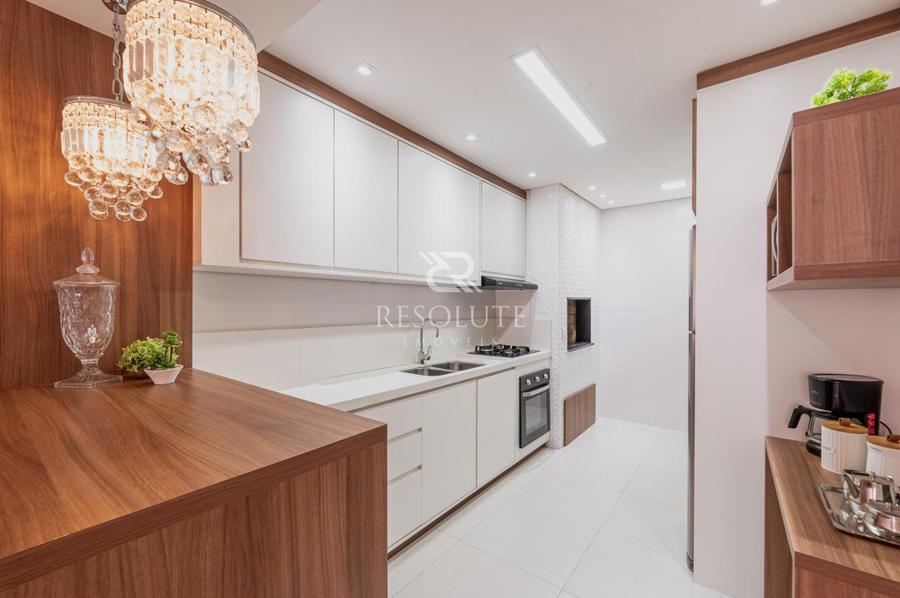 A cozinha completa, equipada com balcão e churrasqueira, integra-se harmoniosamente à sala de jantar, onde uma elegante mesa para seis lugares convida a momentos especiais. A espaçosa sala de estar oferece um ambiente acolhedor para receber visitas, complementada por um lavabo para maior comodidade.