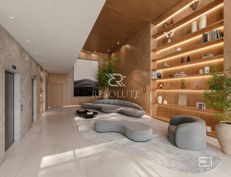 O piso das áreas sociais é revestido em porcelanato de grandes formatos, garantindo um visual contemporâneo e elegante, já nas áreas intimas como os quartos, é utilizado piso de madeira natural, proporcionando um ambiente acolhedor e sofisticado.