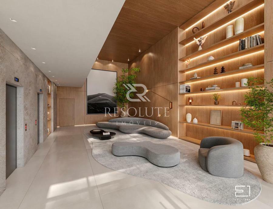 O piso das áreas sociais é revestido em porcelanato de grandes formatos, garantindo um visual contemporâneo e elegante, já nas áreas intimas como os quartos, é utilizado piso de madeira natural, proporcionando um ambiente acolhedor e sofisticado.