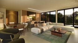O living se destaca por suas amplas aberturas do piso ao teto e pela integração dos espaços. Com acesso direto à varanda nos fundos da casa, os moradores podem desfrutar do sol de final de tarde com vista para a cidade, criando um ambiente perfeito para relaxar e socializar em harmonia com o entorno urbano.