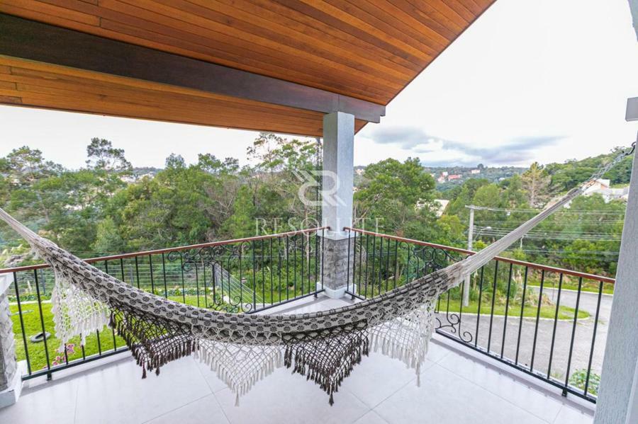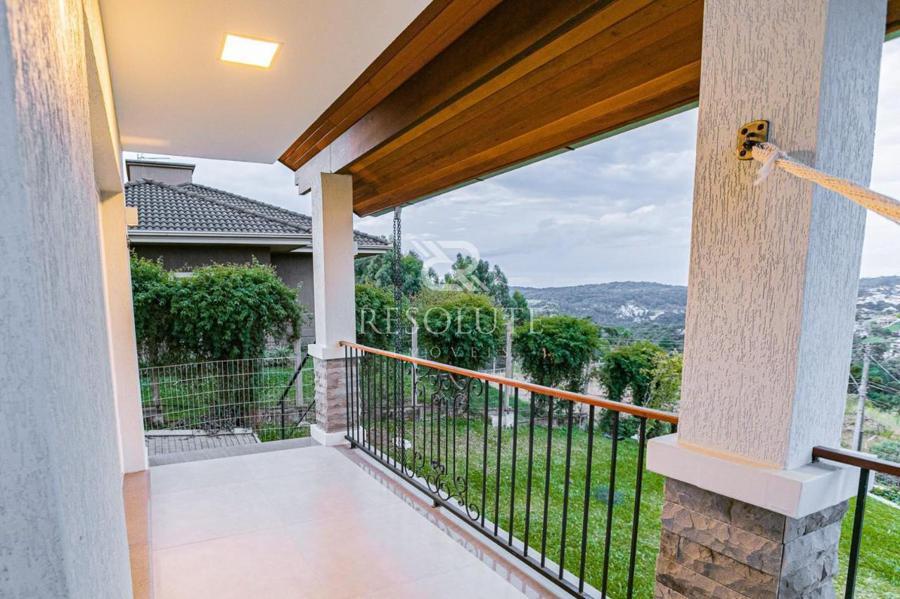 Saindo da sala para a área externa na frente da casa, tem uma linda varanda com vista espetacular que dá de frente para o vale.