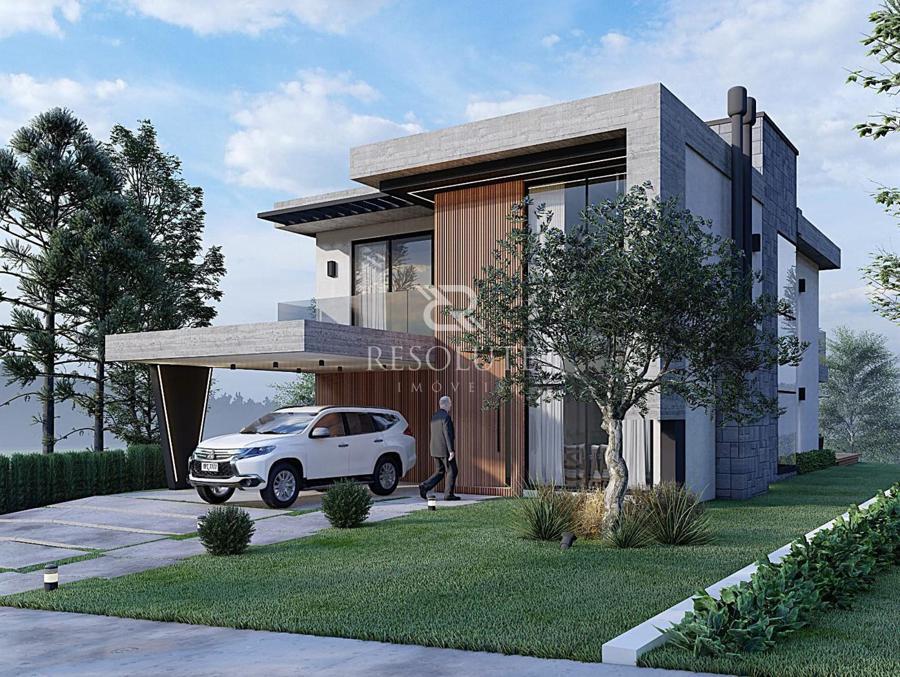 Casa com 310 metros quadrados de área privativa em um terreno de 640 metros quadrados. No térreo, possui sala de estar com pé direito duplo, integrada à sala de jantar, cozinha e espaço gourmet. A área social se conecta a uma varanda externa, e há também um lavabo e uma suíte neste nível. No pavimento superior, encontram-se duas suítes, sendo uma delas uma suíte master com closet. O ambiente inclui ainda um escritório com sacada, lareira com revestimento de churrasqueira e sacadas com guarda-corpo de vidro. No porão, há uma adega com paredes em pedra natural, e os acabamentos internos contam com forro de gesso rebaixado liso. A garagem coberta comporta dois veículos.