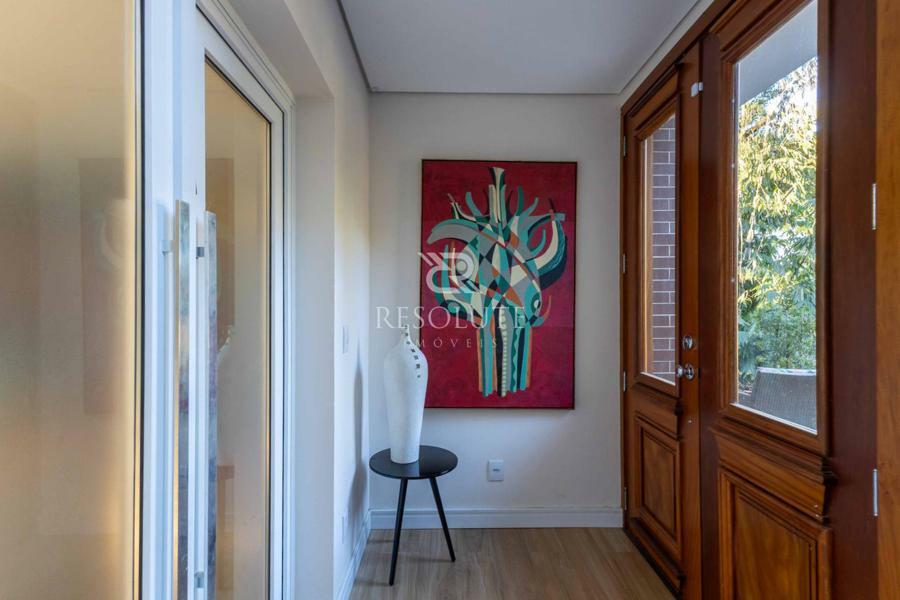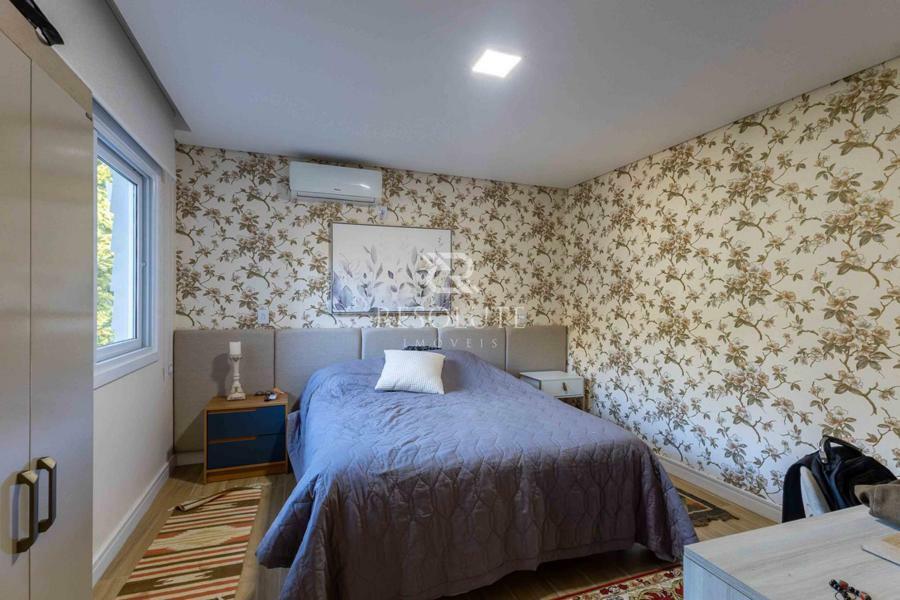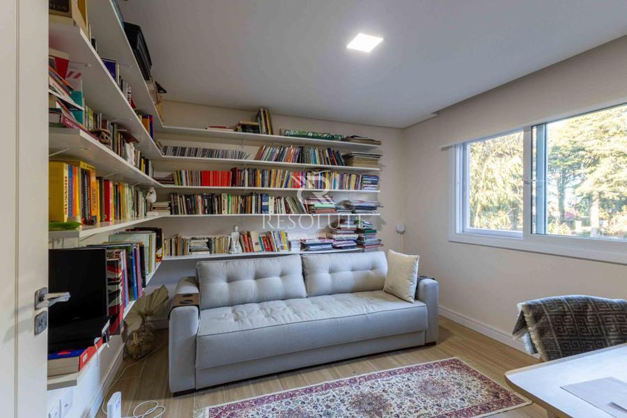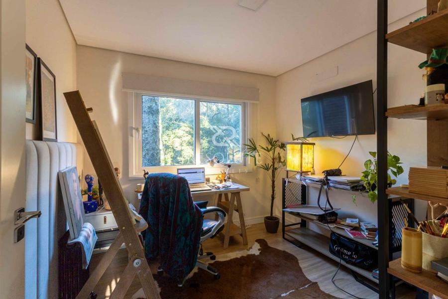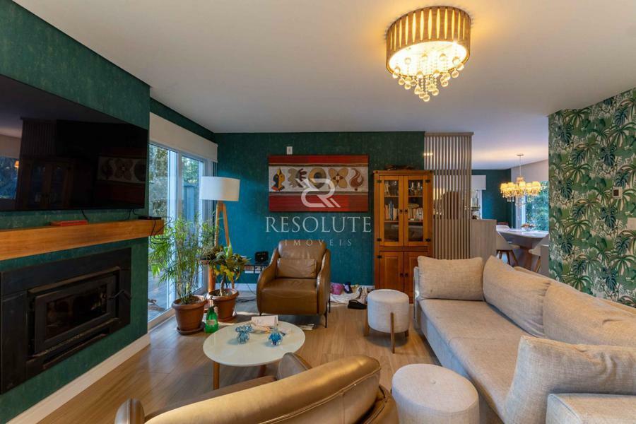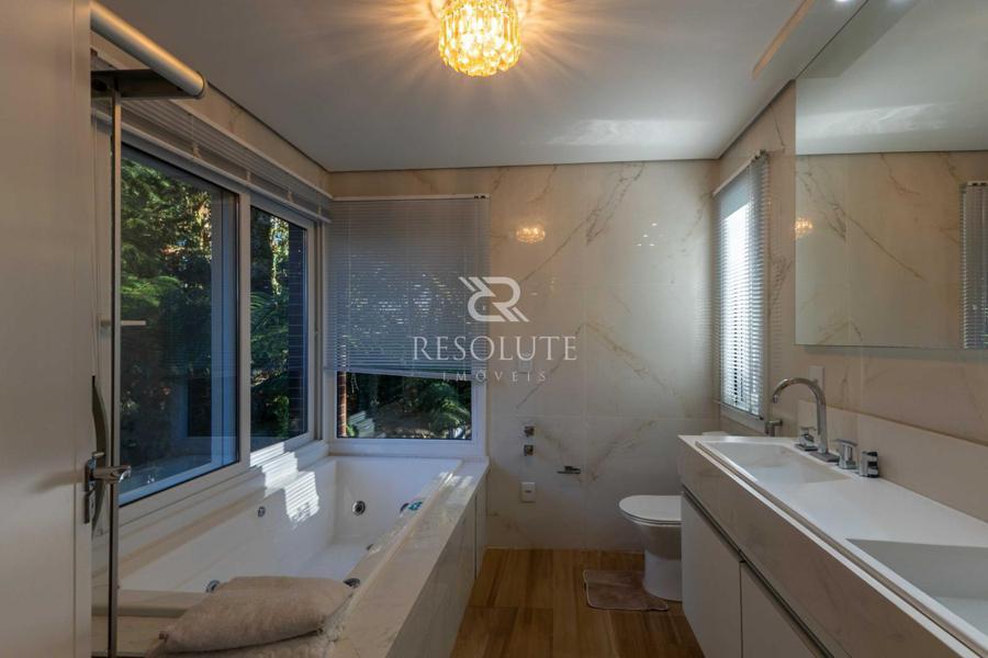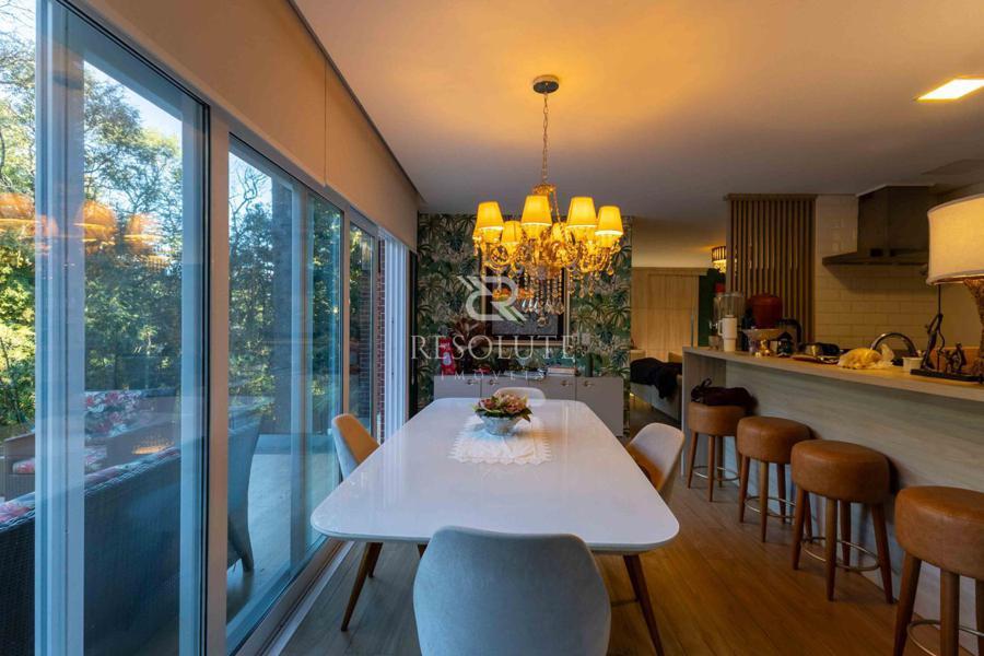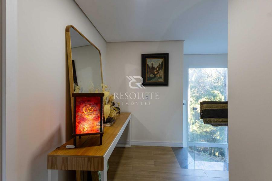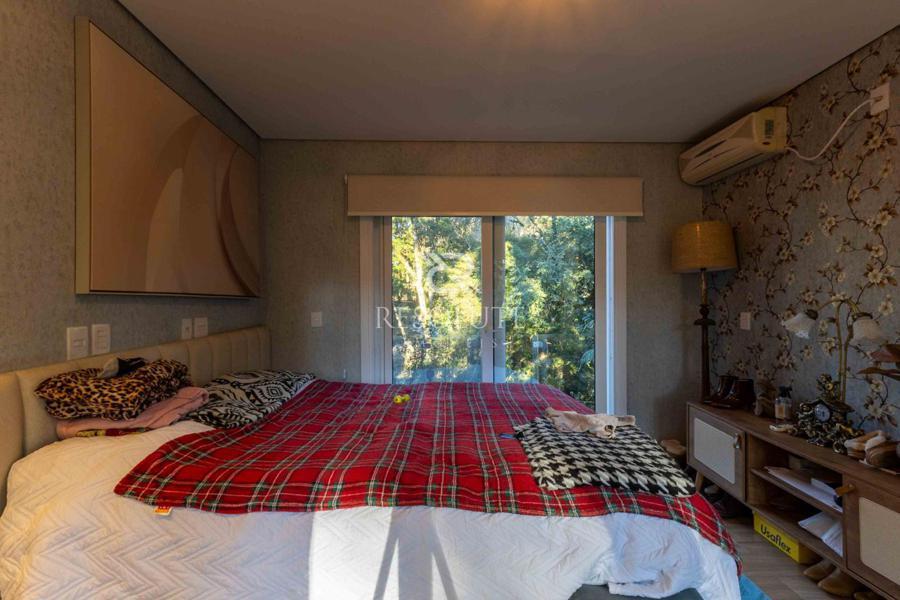 Acima do nível da rua se encontra esta belíssima residência, em estilo inglês com 280,00 m² de área privativa, 4 dormitórios sendo 3 suítes, sendo uma americana, sala de TV, hall de entrada, sala de estar, cozinha com churrasqueira e espaço gourmet, ampla varanda com vista para a natureza, adega, garagens para 4 carros, esquadrias em PVC, piso aquecido, tudo isso em um terreno de 560,00 m². Nas redondezas do terreno se encontra trilhas com muitos xaxims, folhagens e plantas nativas.